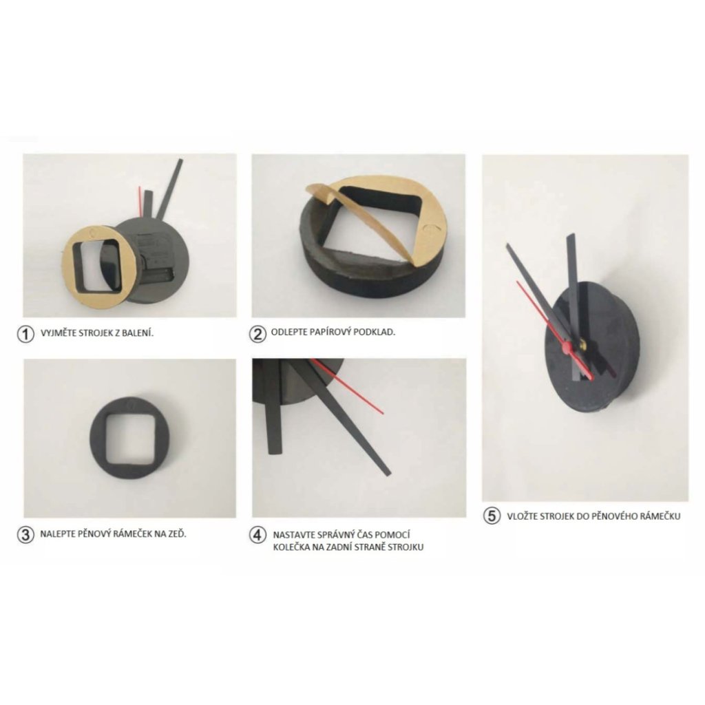 Upozornění: Samolepící hodiny působí na prezentačních fotkách větším dojmem, než je uvedený rozměr. Doporučujeme nejdříve strojek hodin otestovat alespoň 24 hodin před samotnou aplikací na zeď, ať předejdete zbytečnému odlepování hodin ze stěny.