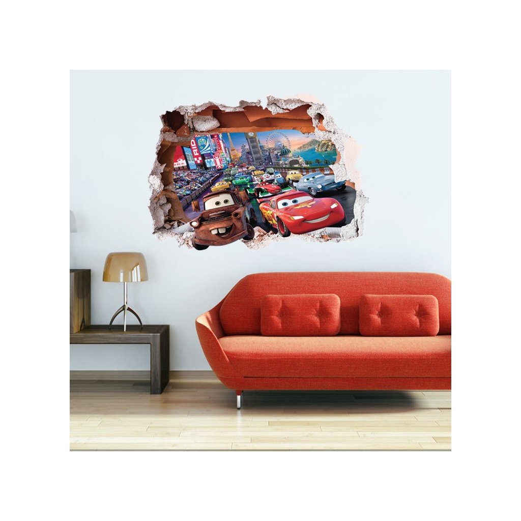 Na této vinylové samolepce na zeď můžete rozpoznat takřka kompletní výčet hlavních hrdinů druhého dílu tolik oblíbené pohádky Auta (Cars), jak se na vás usmívají z dějiště velkého závodu.