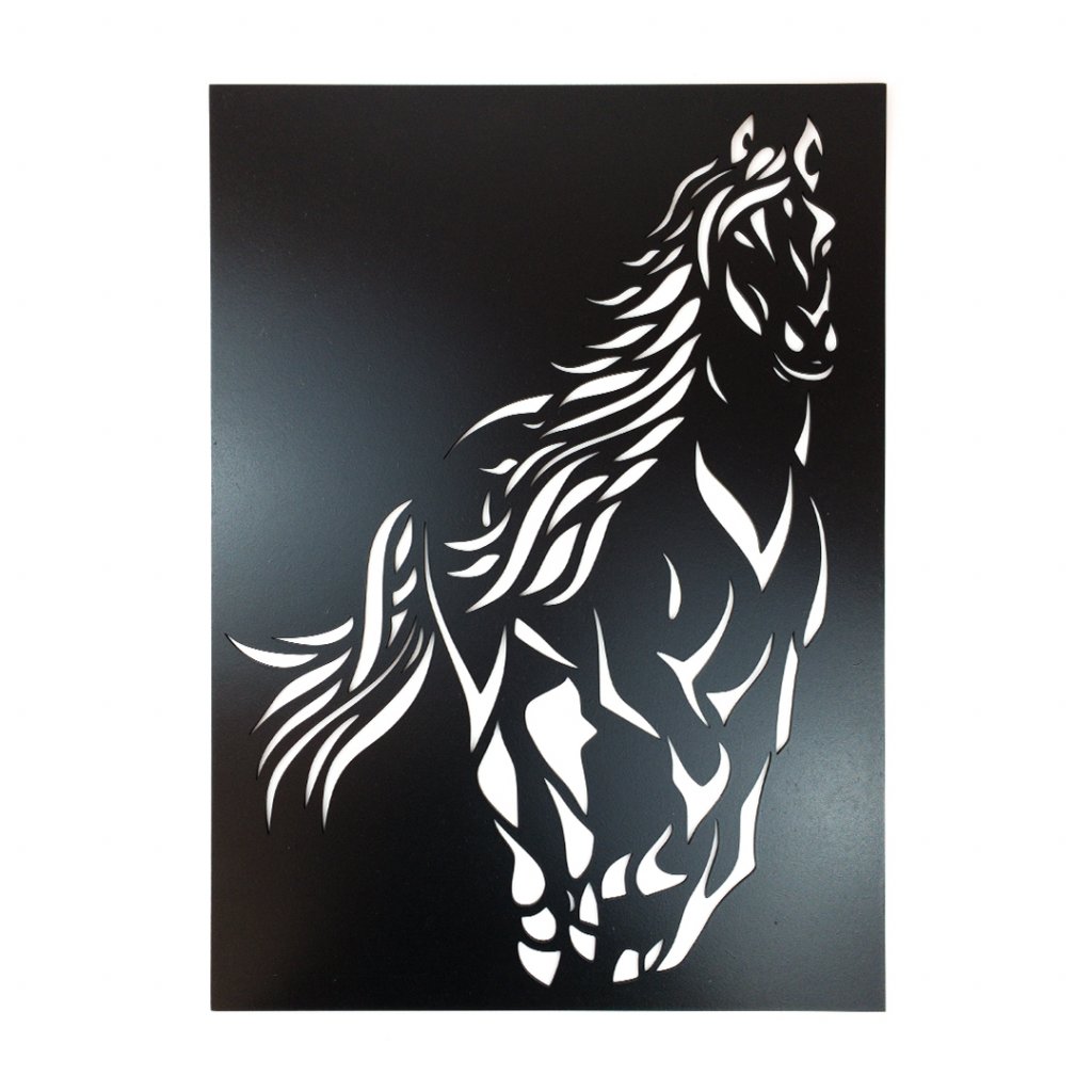 Vkusná nástěnná dřevěná dekorace Klusající kůň černý s 3D efektem o velikosti 67 x 44 cm.