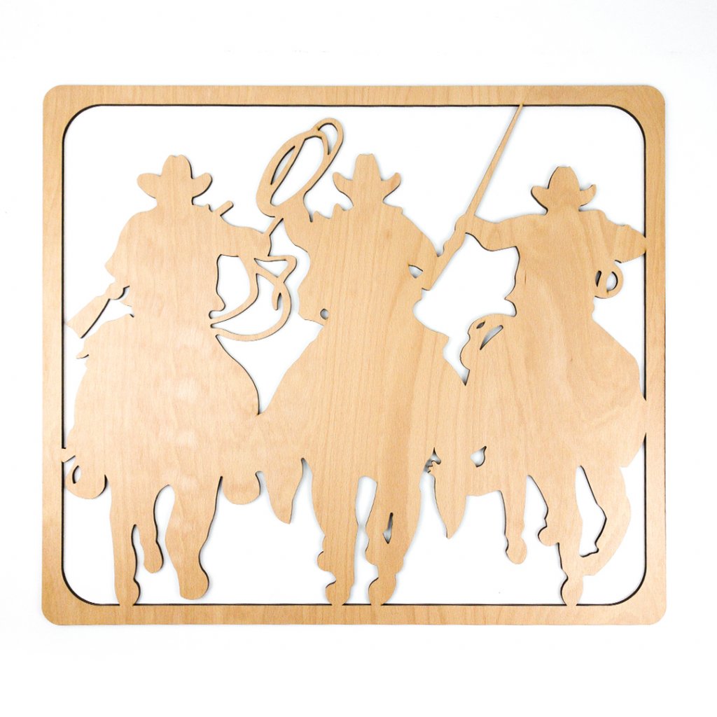 Tato originální bytová dřevěná dekorace Kovbojové není určena pouze pro fanoušky westernu. Skvěle se hodí třeba do obývacího pokoje, pracovny nebo na stěnu klučičího dětského pokoje. Klobouk, laso, vítr ve vlasech, slunce v zádech a pohled na svět z koňského sedla... Co víc by si mohl kovboj přát?! No přece naši dekoraci!