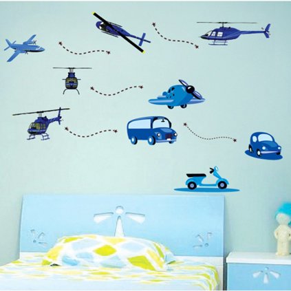 Veselá samolepicí dekorace na zeď s motivem pejsků a auta vycházejícího z obrazu.